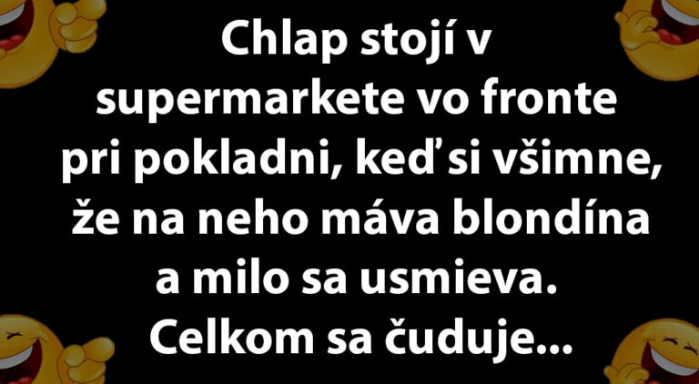 Chlap stojí v supermarkete vo fronte pri pokladni, keď si všimne, že na neho máva blondína a milo sa usmieva. Celkom sa čuduje, že práve k nemu by sa hlásila taká cica. Napriek tomu ide k nej a bez toho, aby tušil, kam ju zaradiť, hovorí: „Ospravedlňujem sa, ale my sa poznáme?“