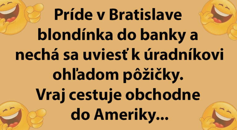 Príde v Bratislave blondínka do banky a nechá sa uviesť k úradníkovi ohľadom pôžičky. Vraj cestuje obchodne do Ameriky a potrebuje si na dva týždne požičať 1000 euro. Úradník na to, že banka potrebuje nejakú záruku, takže blondínka mu nechá kľúčiky od nového BMW. Auto bolo zaparkované pri chodníku, mala na neho doklady, všetko bolo v poriadku.