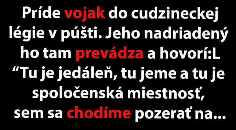 A tak žije vojak v púšti, je tam mesiac, dva mesiace a už je poriadne nadržaný a tak ide za veliteľom, či by mu nepožičal kľúč od ohrady s ťavou. Tak tam ide a za hodinu príde poriadne pokopaný a pohryzený a pýta sa veliteľa: